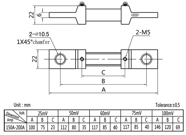 • .Temperature rise: Electrify the shunt with rated current for 2hr, test it after temperature rising stable, the temperature rise should be≤80K when the rated current under 100A; and should be ≤120K when the rated current higher than 100A.