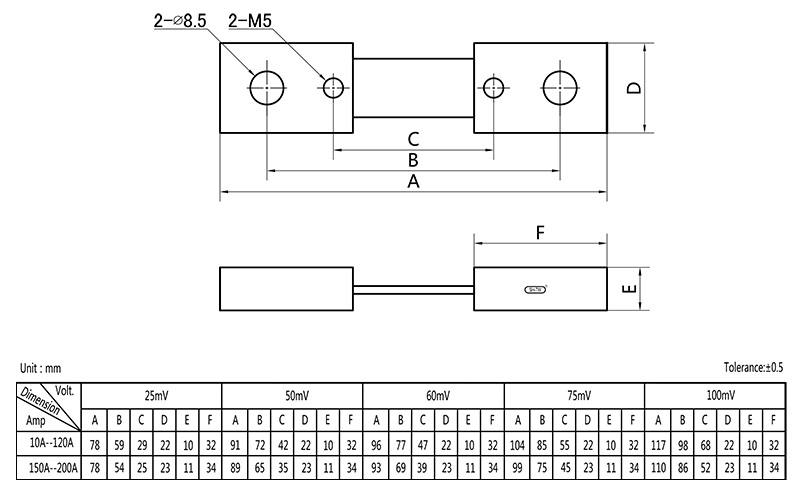 • .Temperature rise: Electrify the shunt with rated current for 2hr, test it after temperature rising stable, the temperature rise should be≤80K when the rated current under 100A; and should be ≤120K when the rated current higher than 100A.